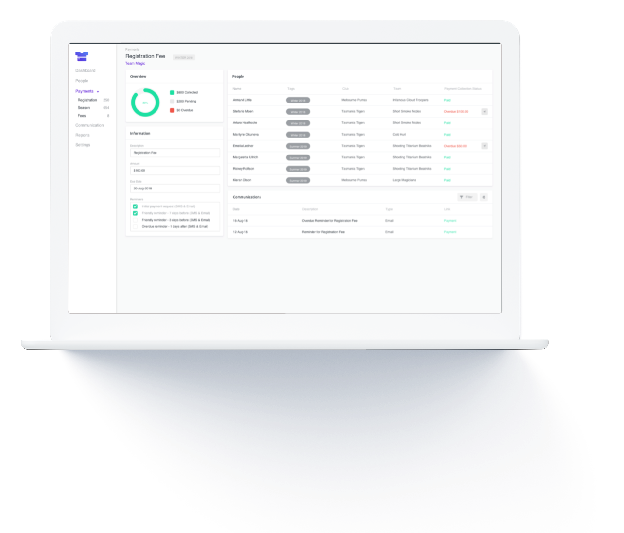 Our platform provides capability for your club or association to manage your payments in one location. This gives you everything you need to request, collect, track and reconcile funds.